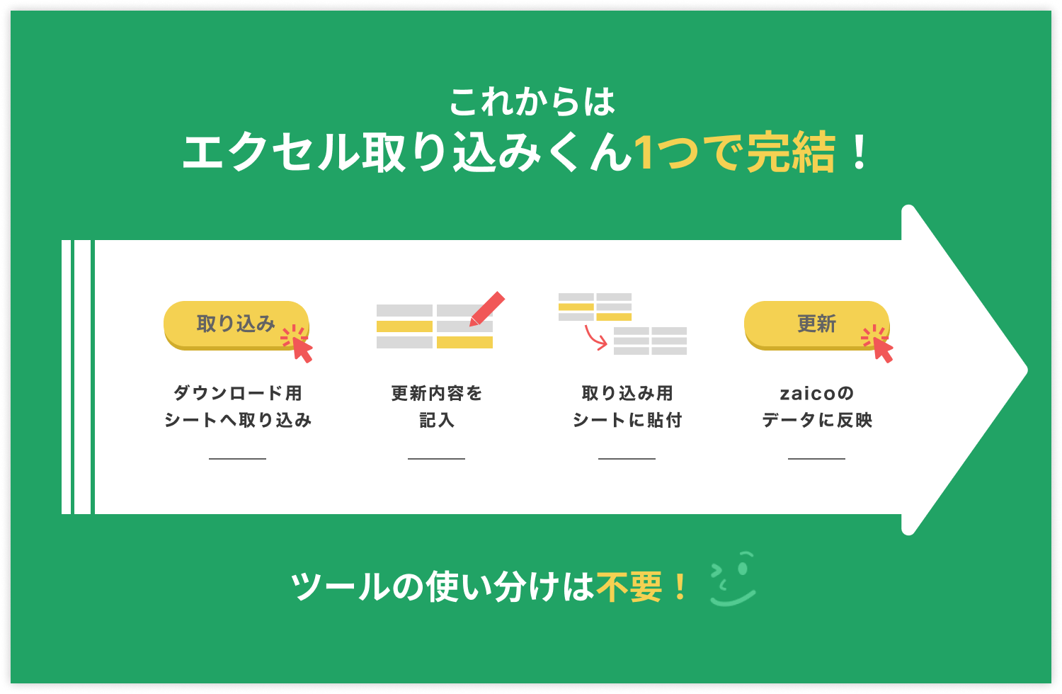 エクセル取り込みくんにダウンロード機能が搭載されたことにより、エクセル取り込みくん一つで「zaicoからデータの書き出し・編集・zaicoへの登録」が完結できるようになります。
