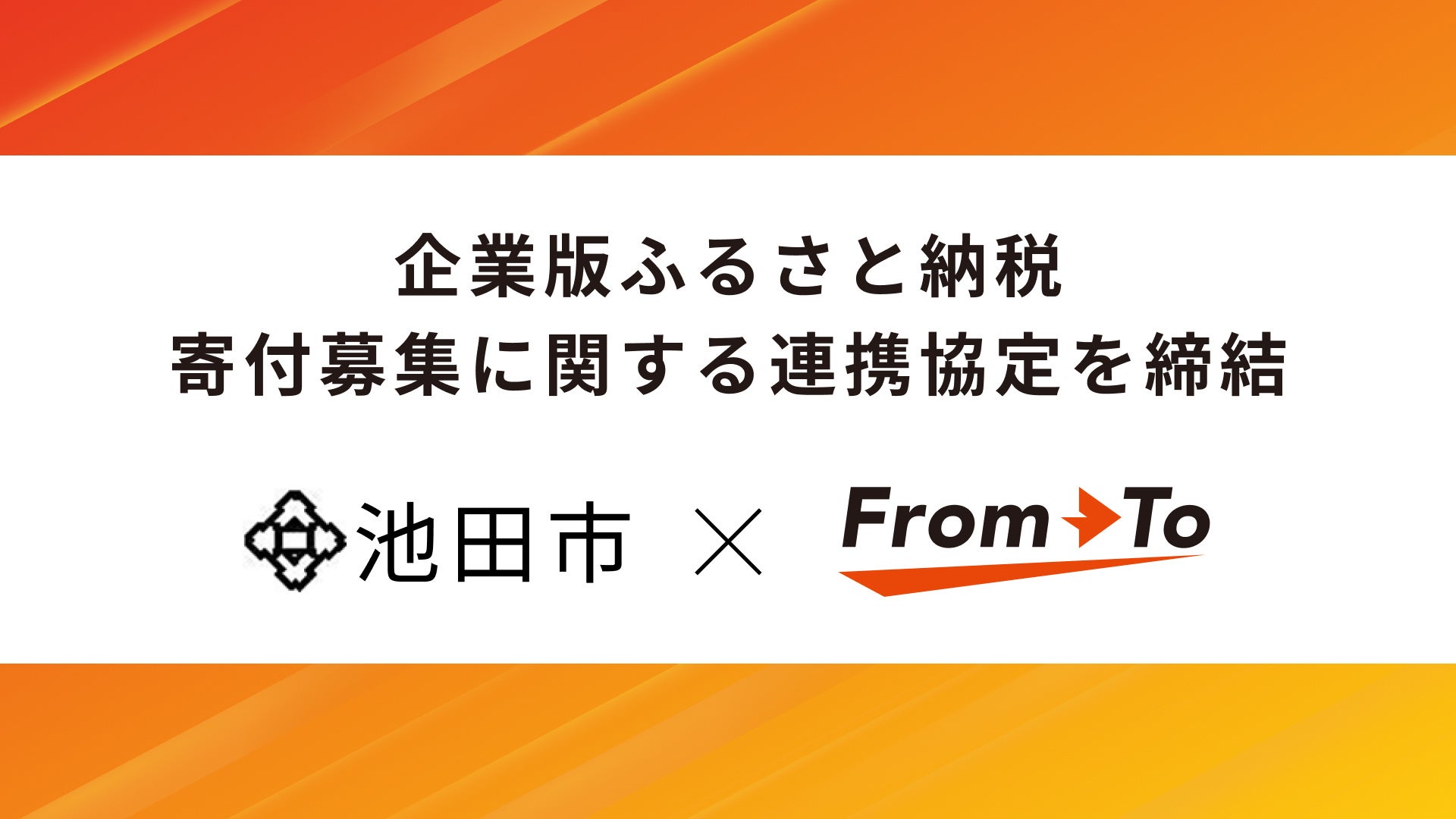 株式会社FromTo(本社:東京都新宿区 代表取締役:宮城浩)は、大阪府池田市と企業版ふるさと納税寄付募集に関する連携協定を締結致しました。池田市の地域再生計画の実施状況を踏まえ、企業への寄附依頼を池田市と連携し行うことで、企業版ふるさと納税寄附増額を目指します。