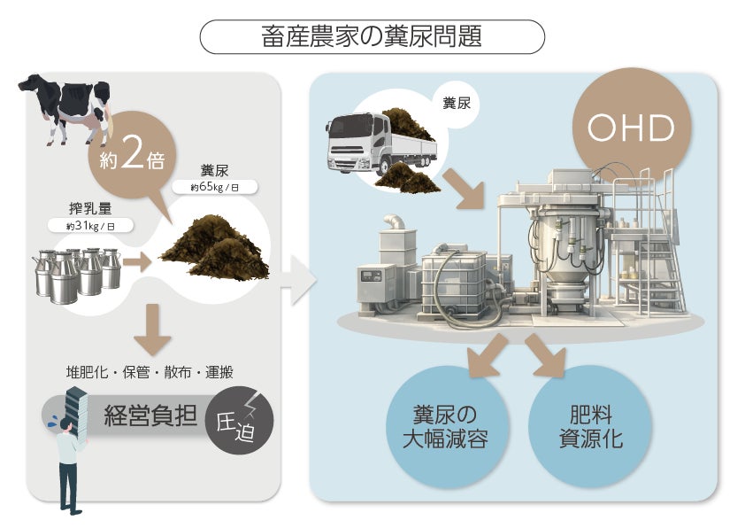 畜産農家では、家畜の飼養に伴い大量の糞尿が日常的に発生し、経営を圧迫する深刻な課題となっています。堆肥化や保管、散布、運搬といった処理工程は、敷地の制約や作業負担に加え、法的管理も求められるため、大きな経営負担となってきました。例えば、乳牛1頭が1日に排出する糞尿量は約65kg※1に達し、これは1日の搾乳量(約31kg)の約2倍※2に相当します。こうしたなか、本実証で確認された高い減容率が実運用でも再現できれば、糞尿の保管量や運搬回数の削減につながり、処理に伴うコストや作業負担の軽減が期待されます。