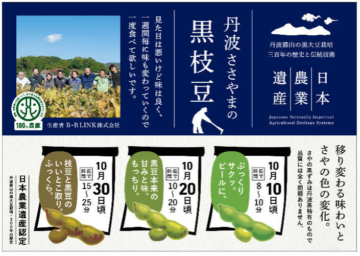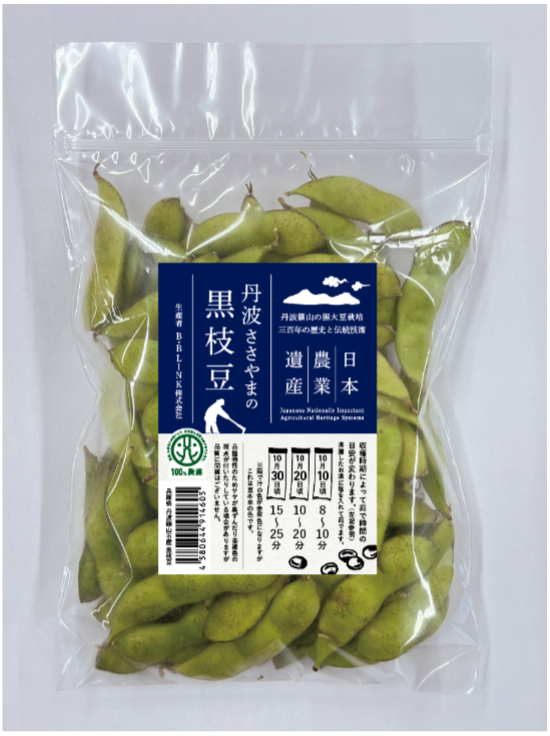 今回の「丹波ささやまの黒枝豆」を生産・提供しているのが丹波篠山の生産者集団B・B LINK株式会社です。「B・B」とは「Black Beans」の略です。丹波篠山市内の20―40代の若手農家7人が発起人となり、設立しました。黒枝豆をメンバーの生産者に出荷してもらい、百貨店やスーパー、市場などへ卸しています。生産者と取引企業を結び、新たな価値を創出しようという、生産者発の試みです。