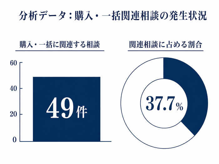 ・算出方法: 相談記録内に「購入」「一括」「買い取り」「買い切り」「総額」「リース比較」「残債」「再リース」など、購入・一括検討に関連する語句または文脈が確認されたものを1件として集計。同一相談内で複数回出現した場合も1件としてカウント。構成比は、購入・一括関連相談49件を有効サンプル数130件で除して算出。