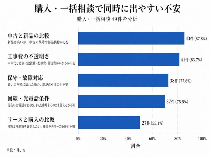購入・一括相談で同時に出やすい不安として、中古と新品の比較が43件、工事費の不透明さが41件、保守・故障対応が38件、回線・光電話条件が37件、リースと購入の比較が27件確認されました。