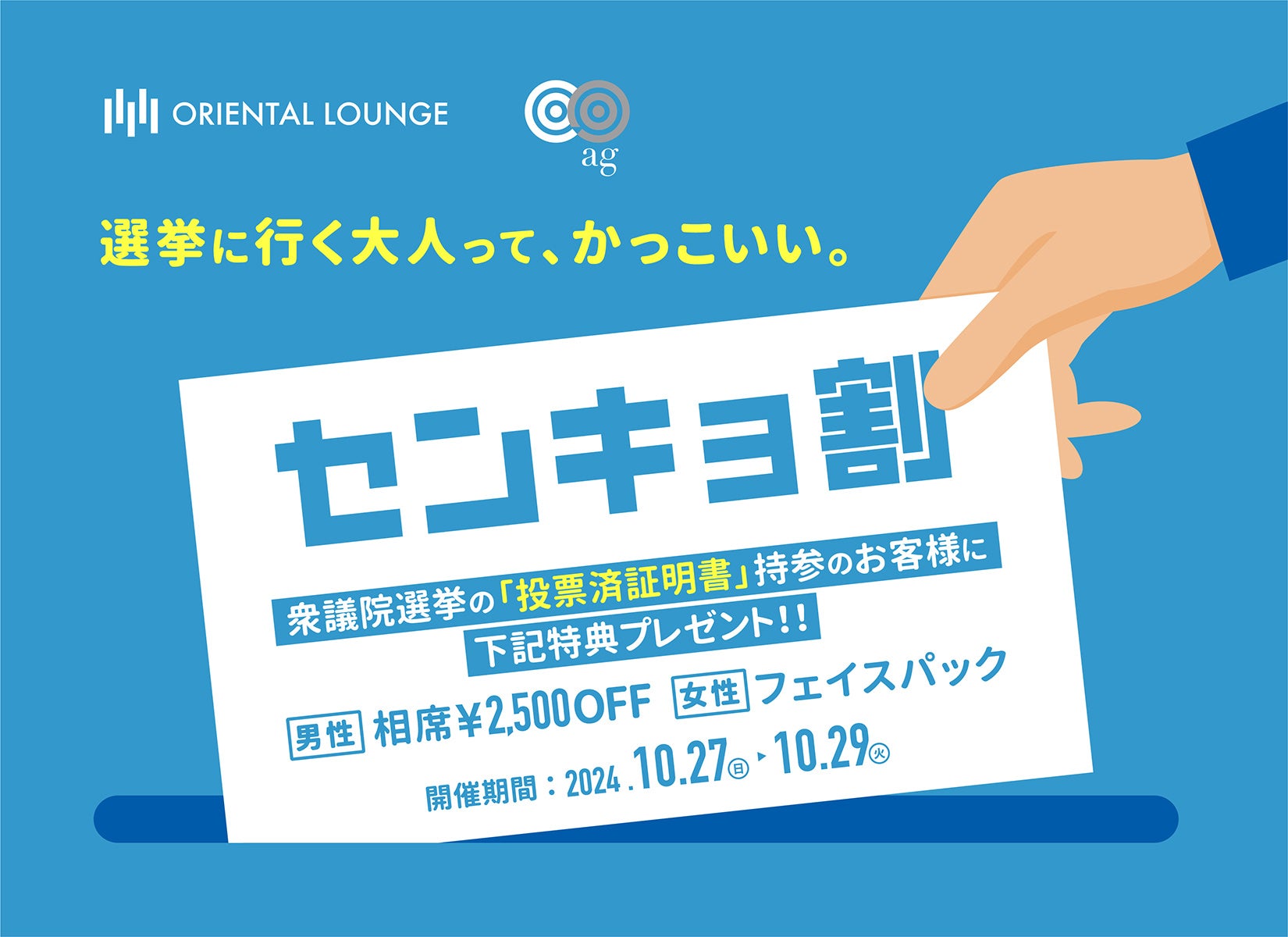 株式会社クラウドエヌ(本社:東京都渋谷区、代表取締役:西山喜洋、以下「当社」)は、2024年10月27日(日)に投開票される第50回衆議院議員総選挙(以下「衆議院選」)に際し、10月27日(日)~10月29日(火)の期間限定で日本国内の「オリエンタルラウンジ」および「ag(アグ)」全店において「センキョ割」を実施。キャンペーン期間中、衆議院選の投票済証明書をご提示いただいたお客様を対象に、男性:利用料金から2500円割引、女性:フェイスパックをプレゼントいたします。