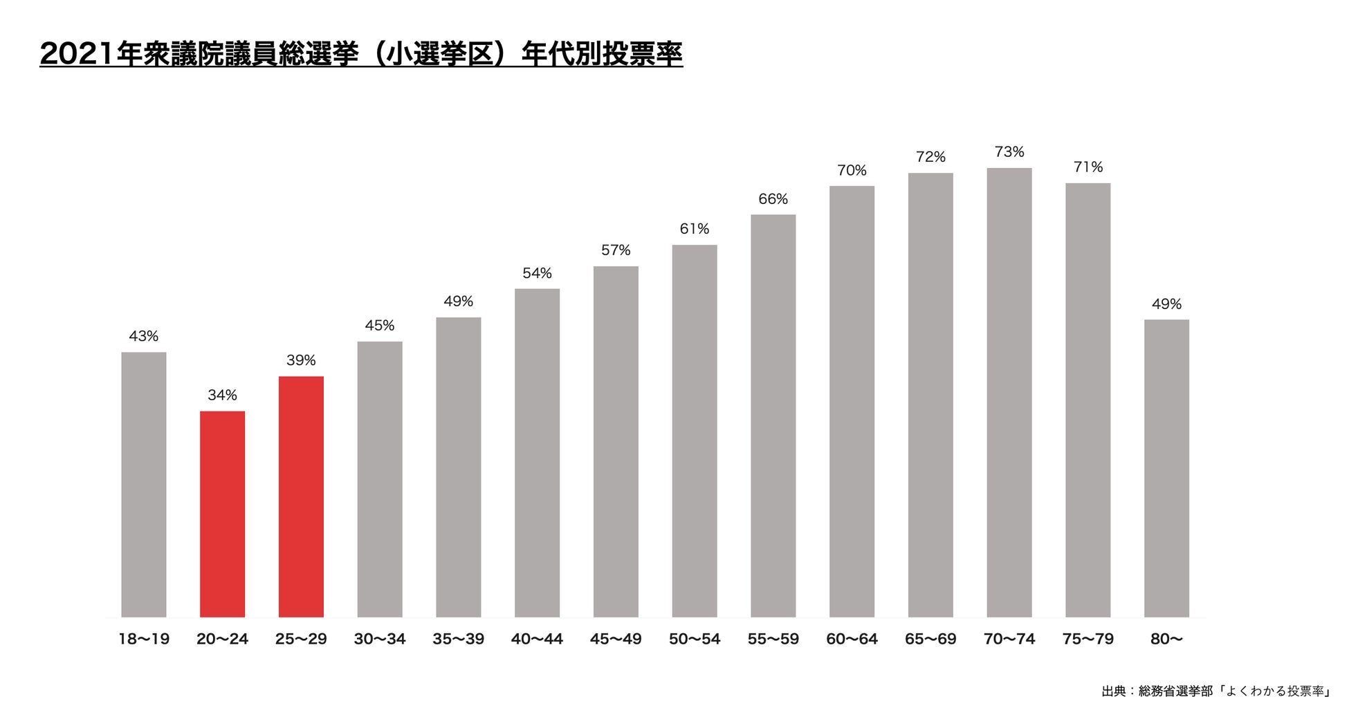 近年、衆議院選の投票率は50%台で推移しており、特に20代の投票率は30%台と低迷しています。この数値は70代の投票率の約半分です。