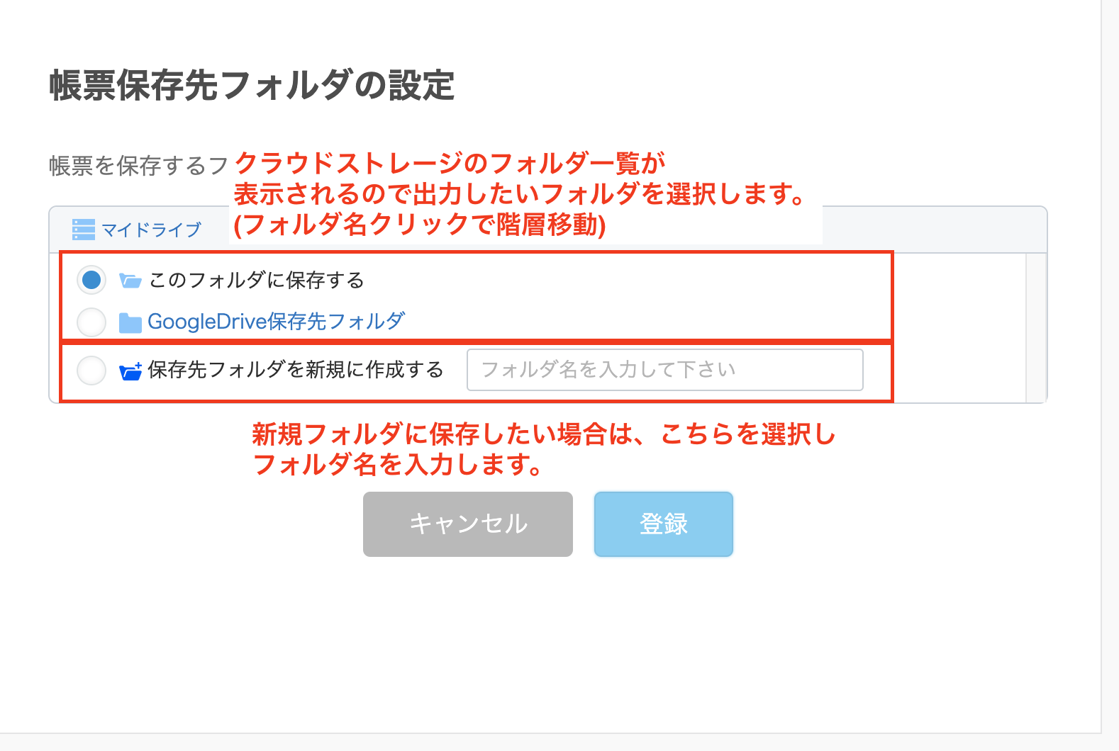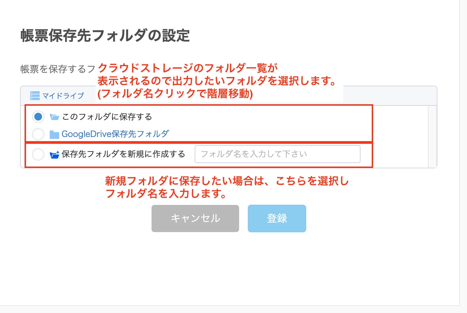 対象フォルダは、Googleドライブの場合は<マイドライブ>内にあるフォルダ、Dropboxの場合はアカウントのフォルダ一覧となります。