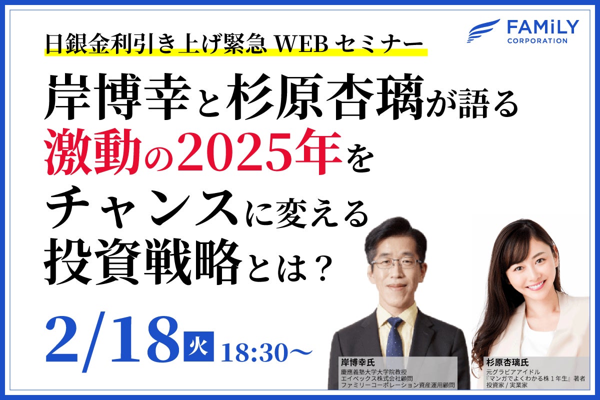 2025年2月18日(火)18:30~、弊社の資産運用顧問である経済評論家の岸 博幸氏と元グラビアアイドルでありながら投資家としても注目を集める杉原 杏璃氏をゲストにお迎えし、特別オンラインセミナーを開催いたします。
