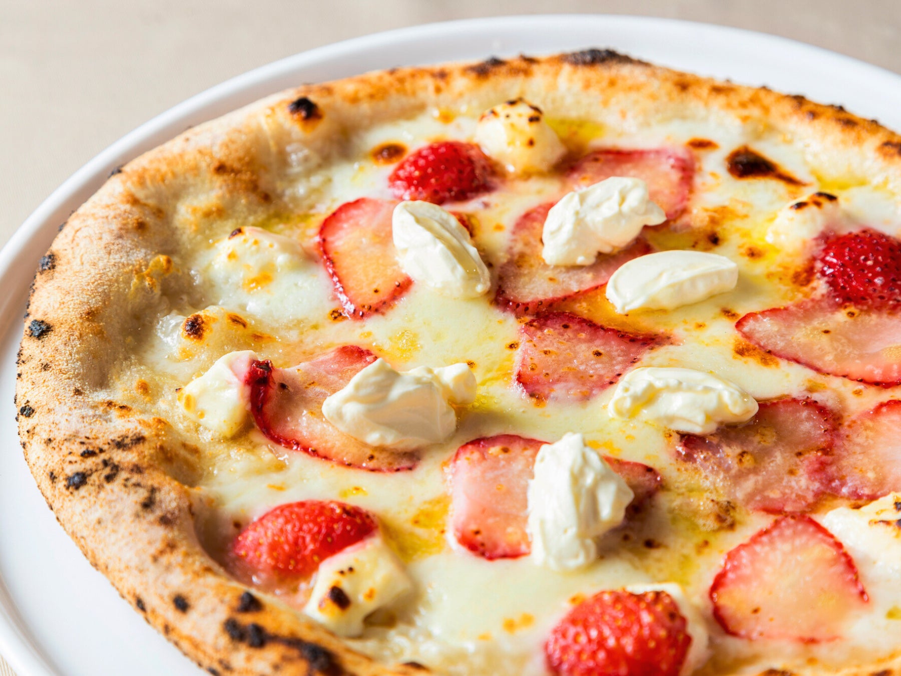 完熟イチゴの甘酸っぱさと濃厚なチーズ、自然な甘さの蜂蜜が絶妙に絡む、見た目も華やかなピッツァ。