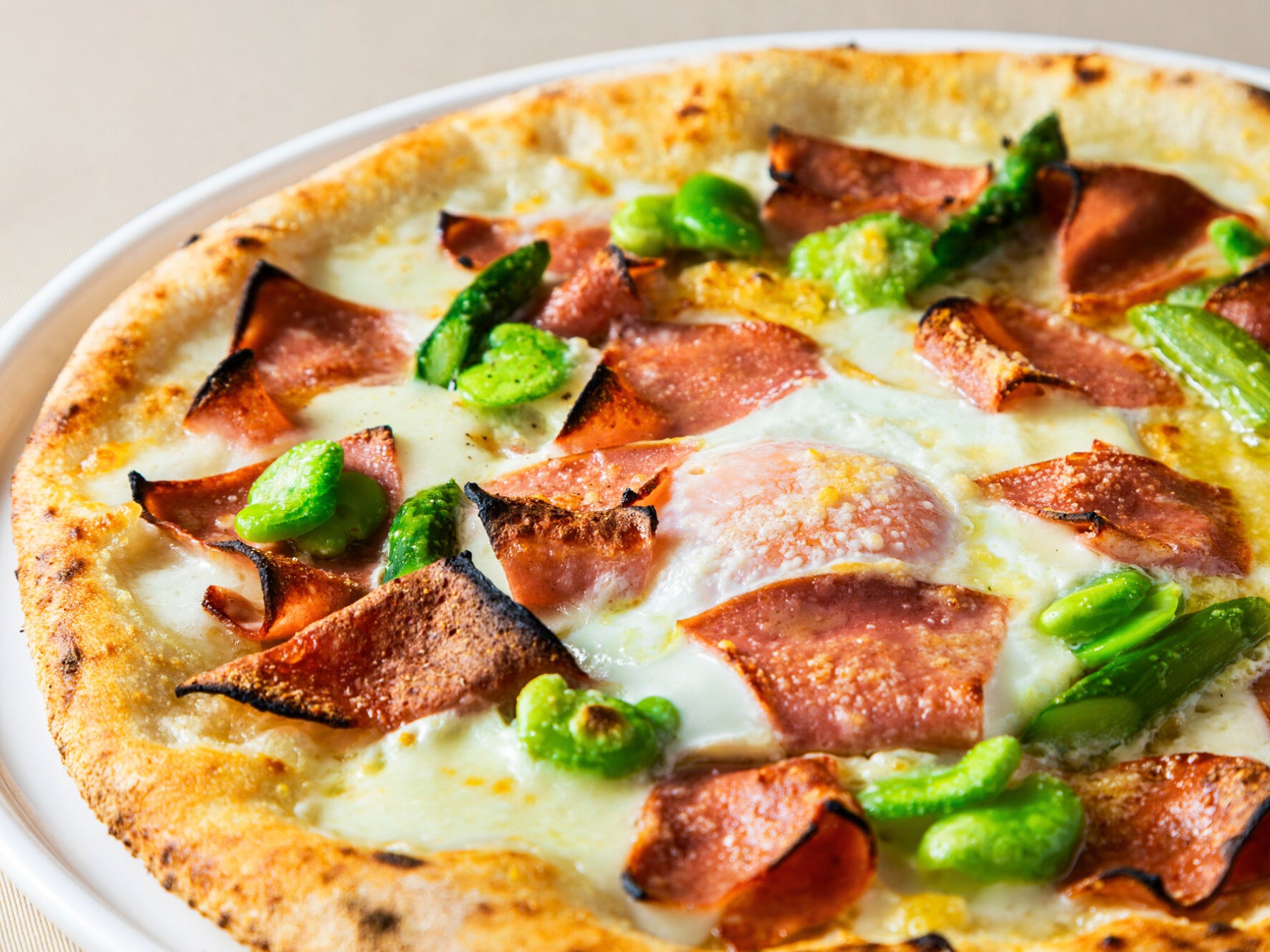 まろやかな半熟卵ととろけるチーズが人気の定番ピッツァ「ビスマルク」にそら豆をトッピングした春限定アレンジ。