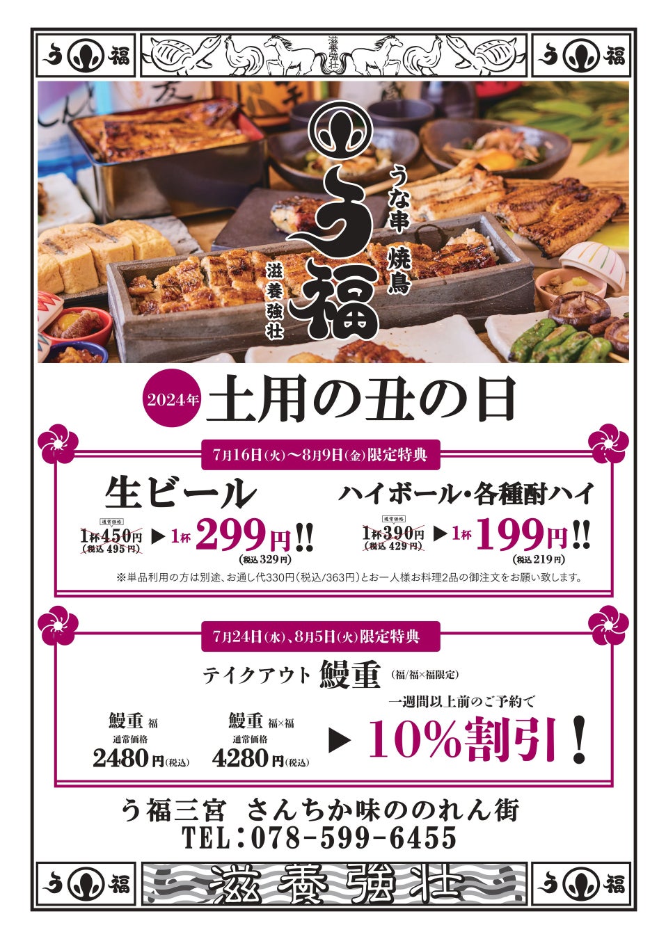 【夏の土用の丑の日】三宮の人気店「う福」が2024年夏の土用の丑の日キャンペーンとして二大特典をご用意!!鰻重テイクアウト事前予約10%割引&対象期間のドリンクずっと割り開催♪