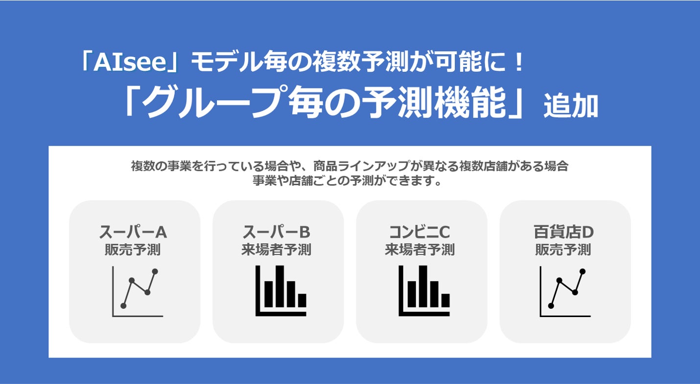 「AIsee」は販売開始後1年間で小売業、飲食業、製造業等のお客様にご利用をいただき、お寄せいただいたご要望から多くの機能を改善・追加してきました。主なものは、「予測期間の延長(1ヶ月予測から6ヶ月予測)」や「断続データへの対応」となります。ぜひこの機会にパワーアップした「AIsee」をお試しください。
