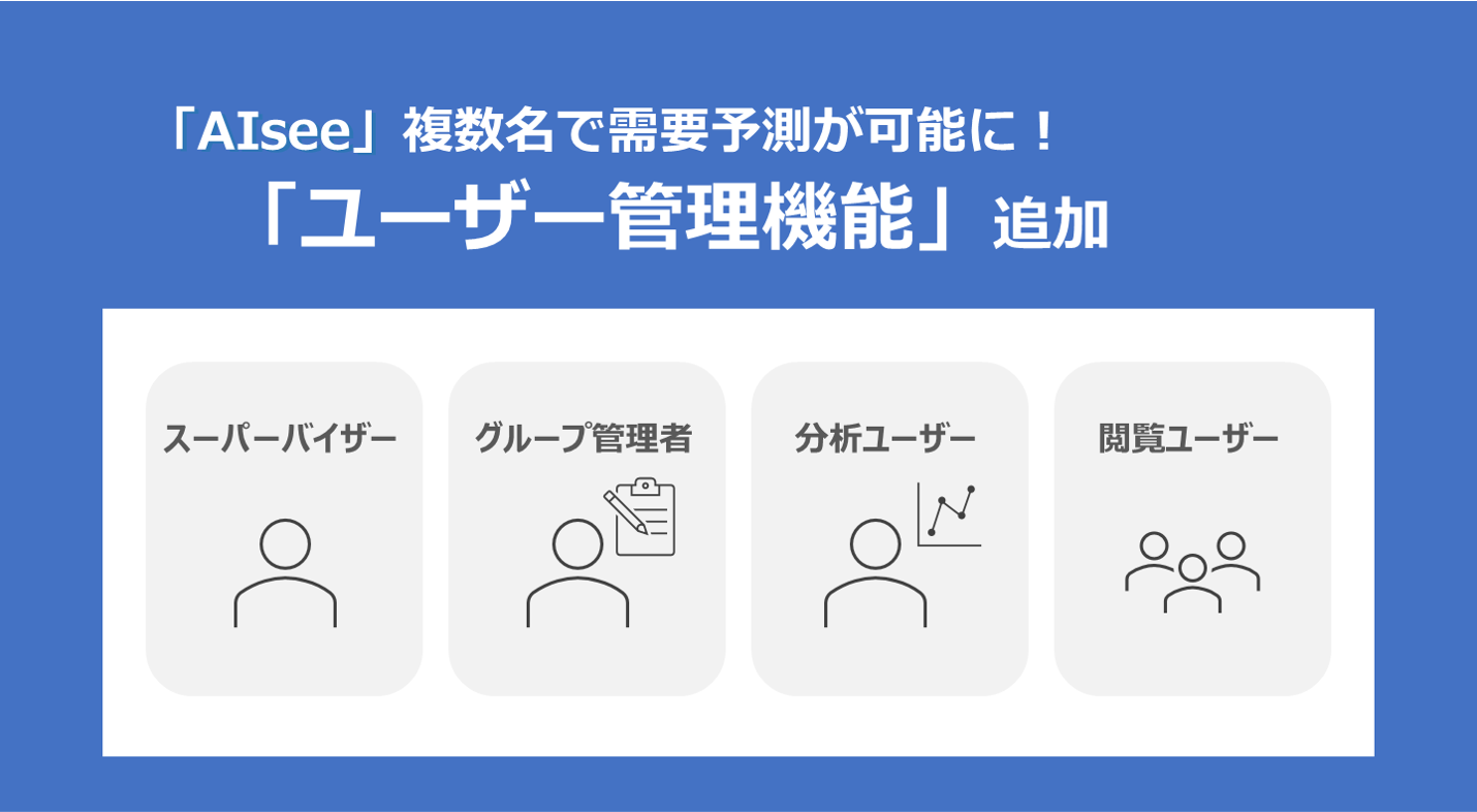 また、これまでは予測したい内容ごとにライセンスの取得が必要でしたが、1ライセンスで複数の予測を実行できるようになりました。さらに、多くのお客様にご利用いただけるサービスを目指し、「ユーザー管理機能」を追加しました。「スーパーバイザー(管理者)」・「グループ管理者」・「分析ユーザー」・「閲覧ユーザー」の4つのユーザー権限に合わせて機能を制限し、複数名での管理が可能となりました。