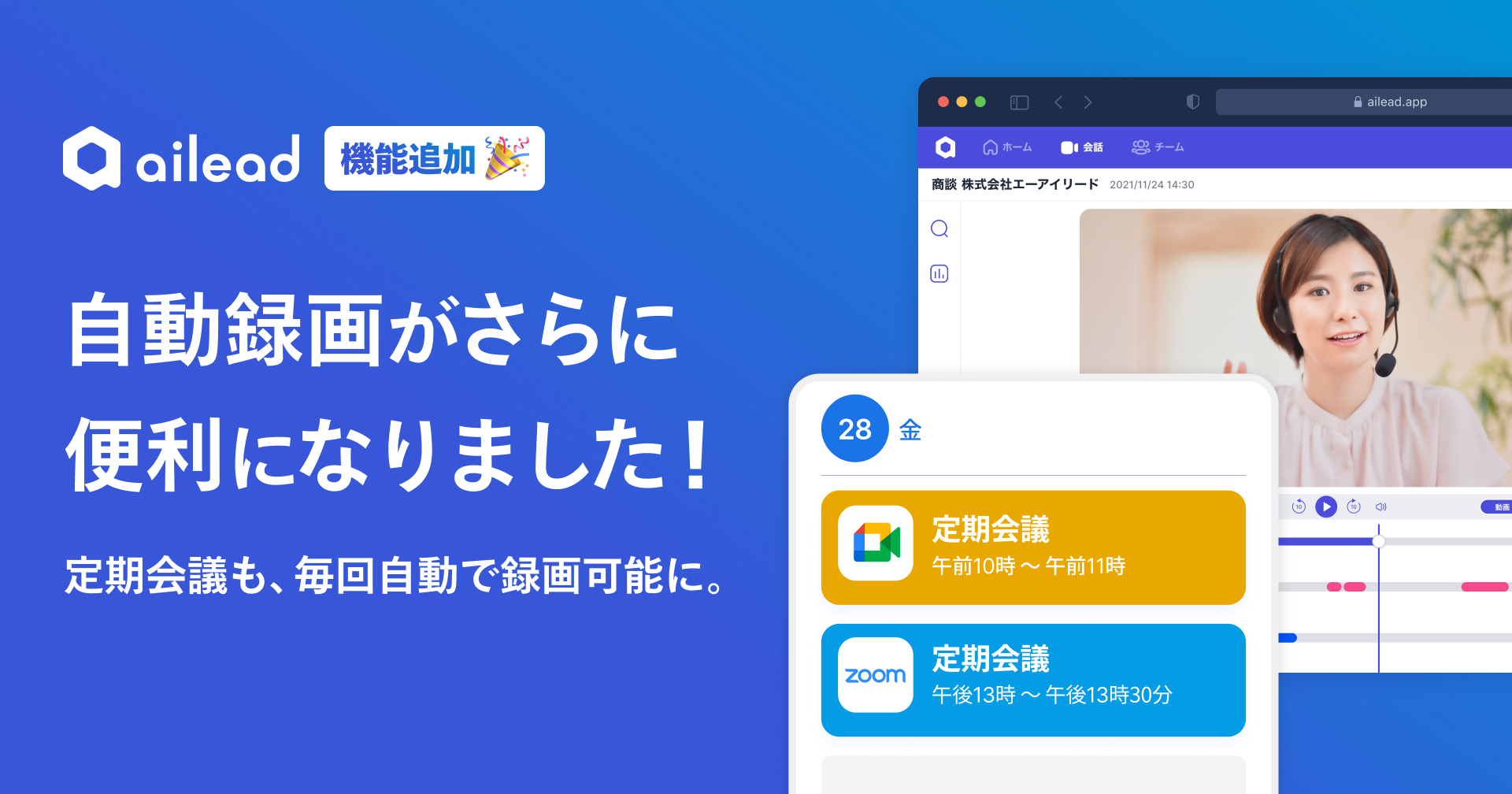 クラウド商談解析ソフト「ailead」、定期開催の会議を自動で録画する新機能を追加