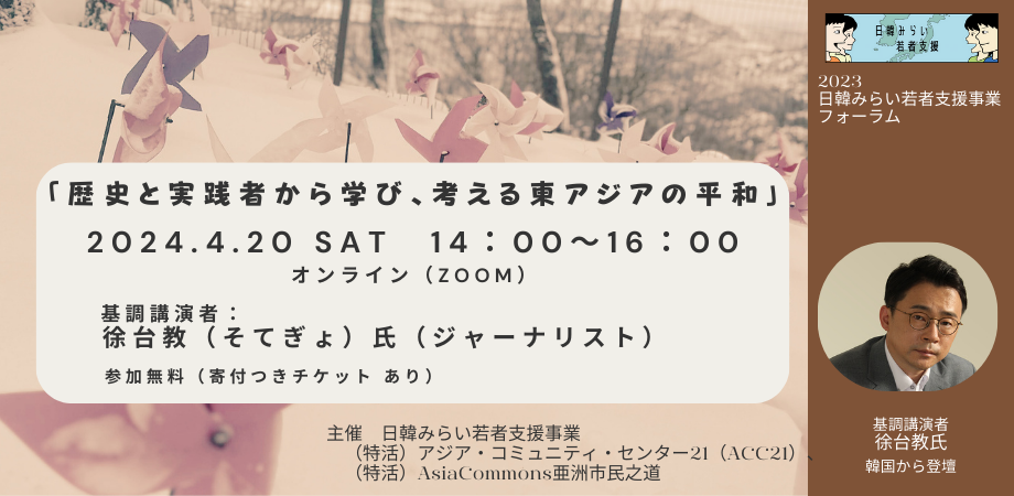 韓国在住のジャーナリスト徐台教氏を基調講演者に迎え、「日韓みらい若者支援事業」の2023年度の活動を報告するフォーラムを開催します!【詳細:http://ptix.at/dSCa4f】