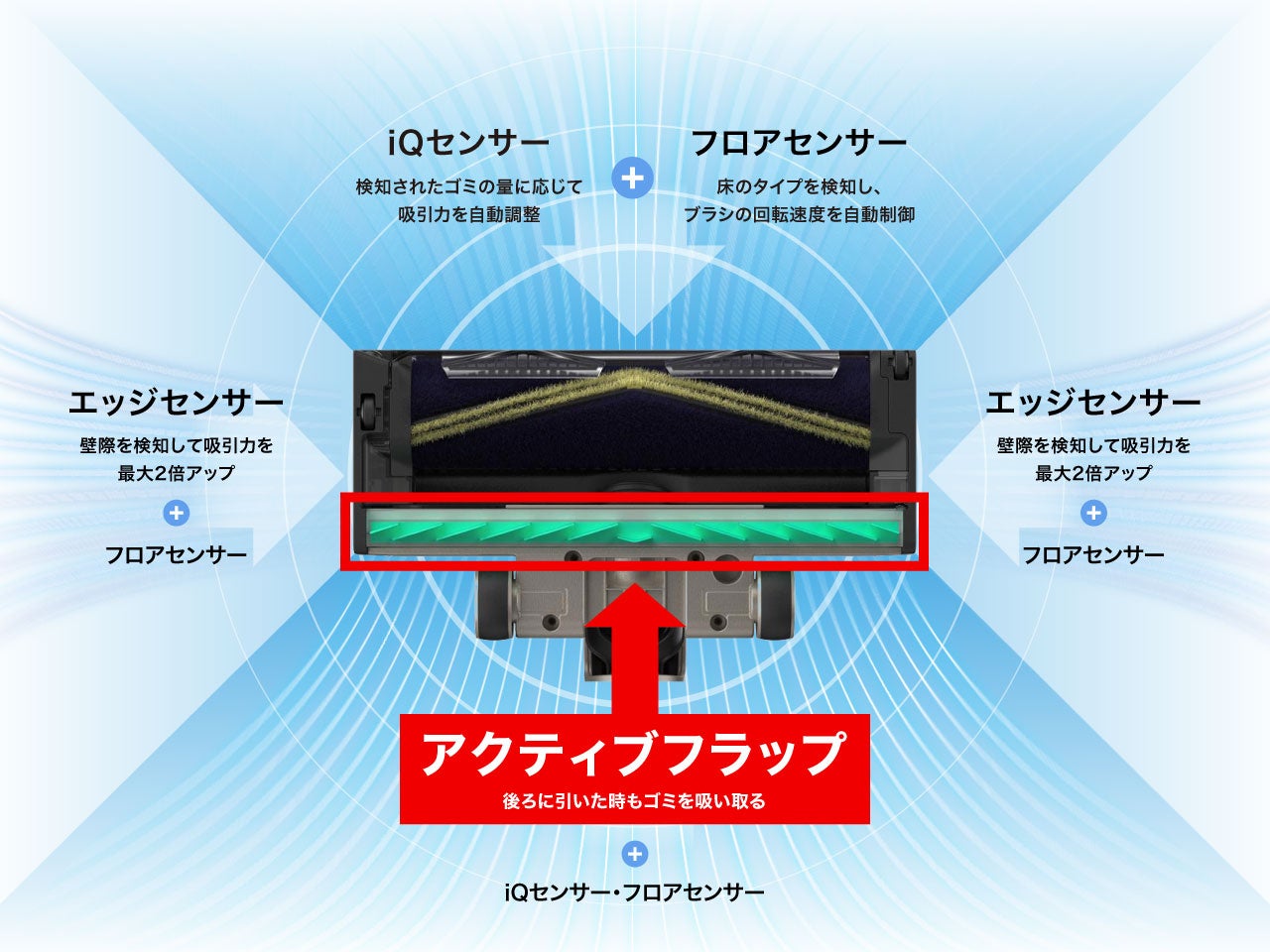 3つのセンサーと「アクティブフラップ」の組み合わせにより「360°クリーニング」が実現。普段のお掃除の仕方を変えずに、利用者が意識せずとも、従来通り前後に動かすだけでこれまで以上に効果的かつ効率的なお掃除を実現します。