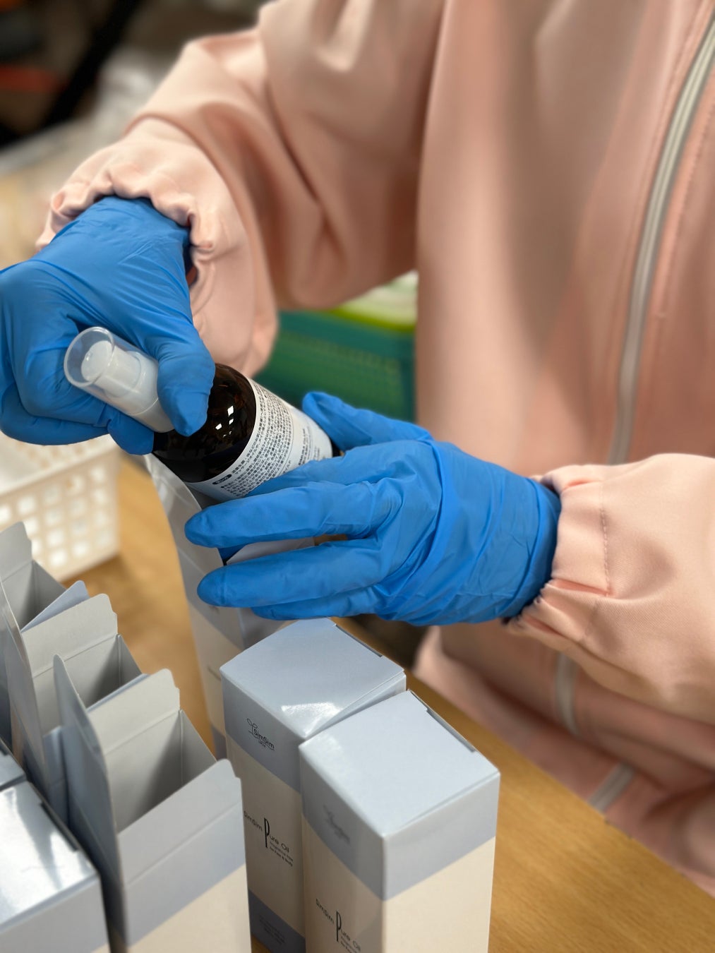 ラベリングが完了した製品を検品し、不良品がないかを確認します。その後、製品を箱に詰めます。