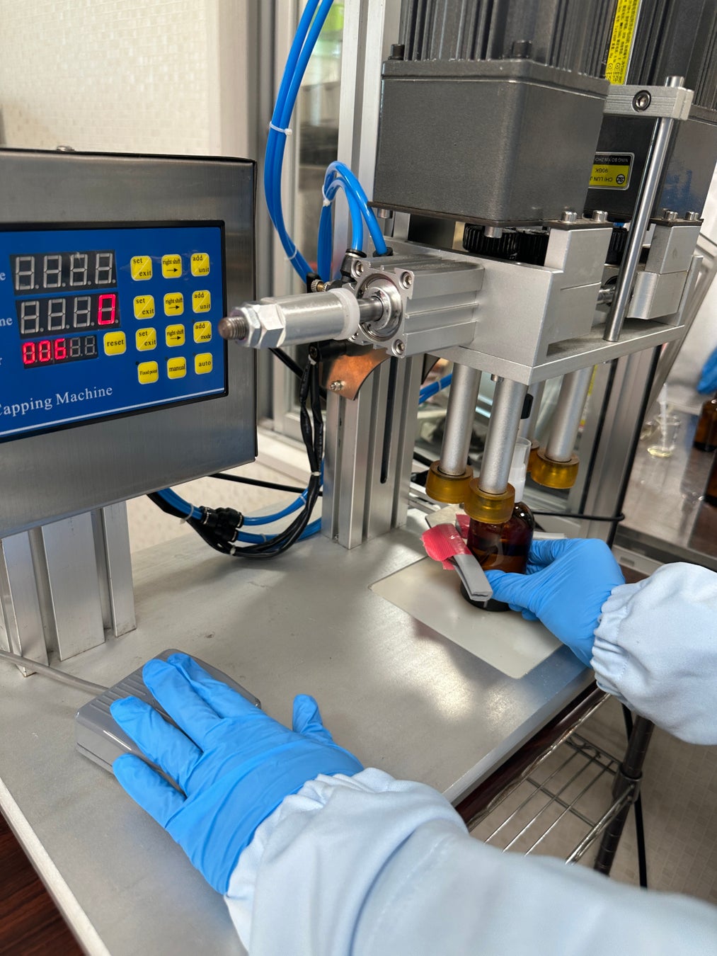 次に、充填されたボトルのキャップを締めます。キャッピングマシンを使用して、キャップがしっかりと閉まるようにします。