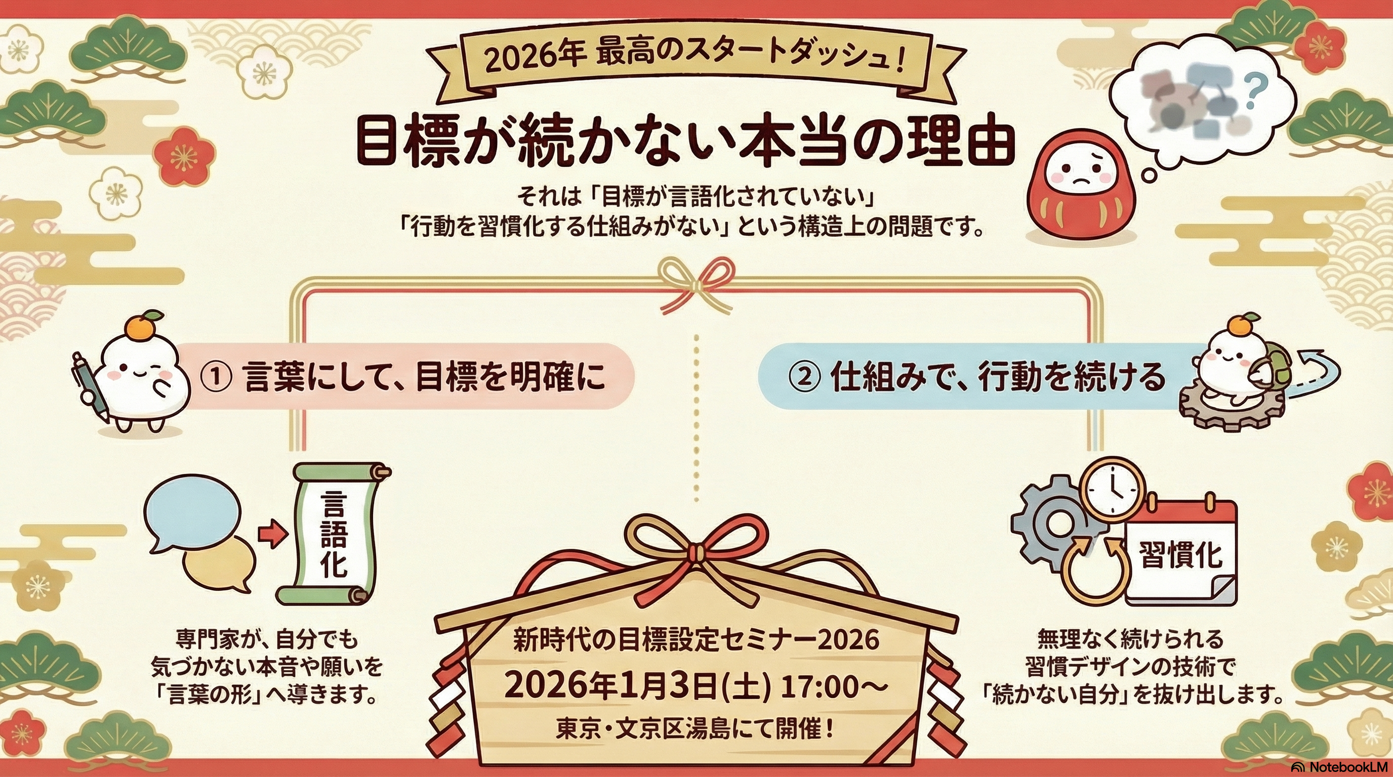 本セミナーは、“言葉の整理” と “続く仕組み” にフォーカスした、新年にしか体験できない特別プログラムです。