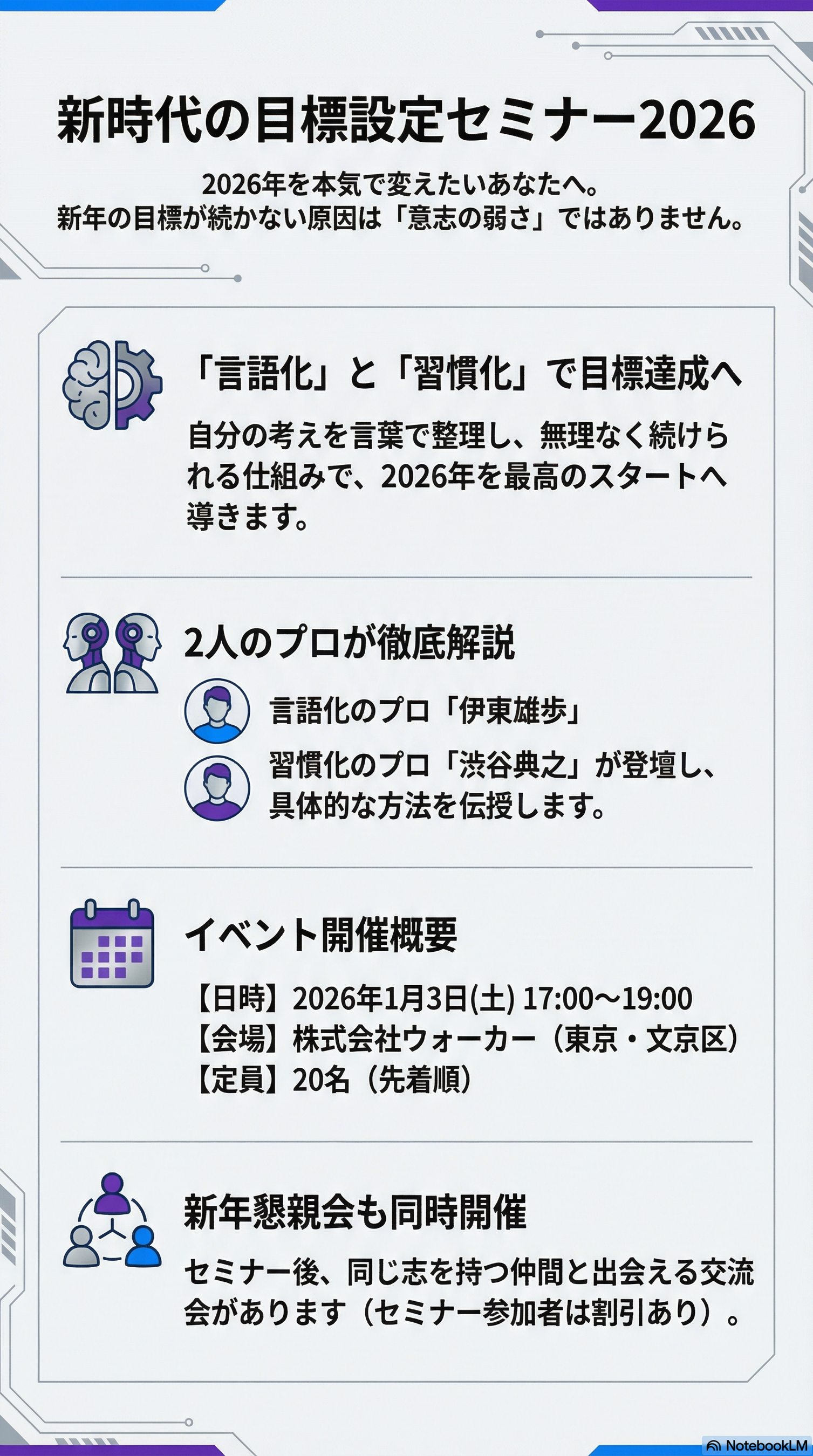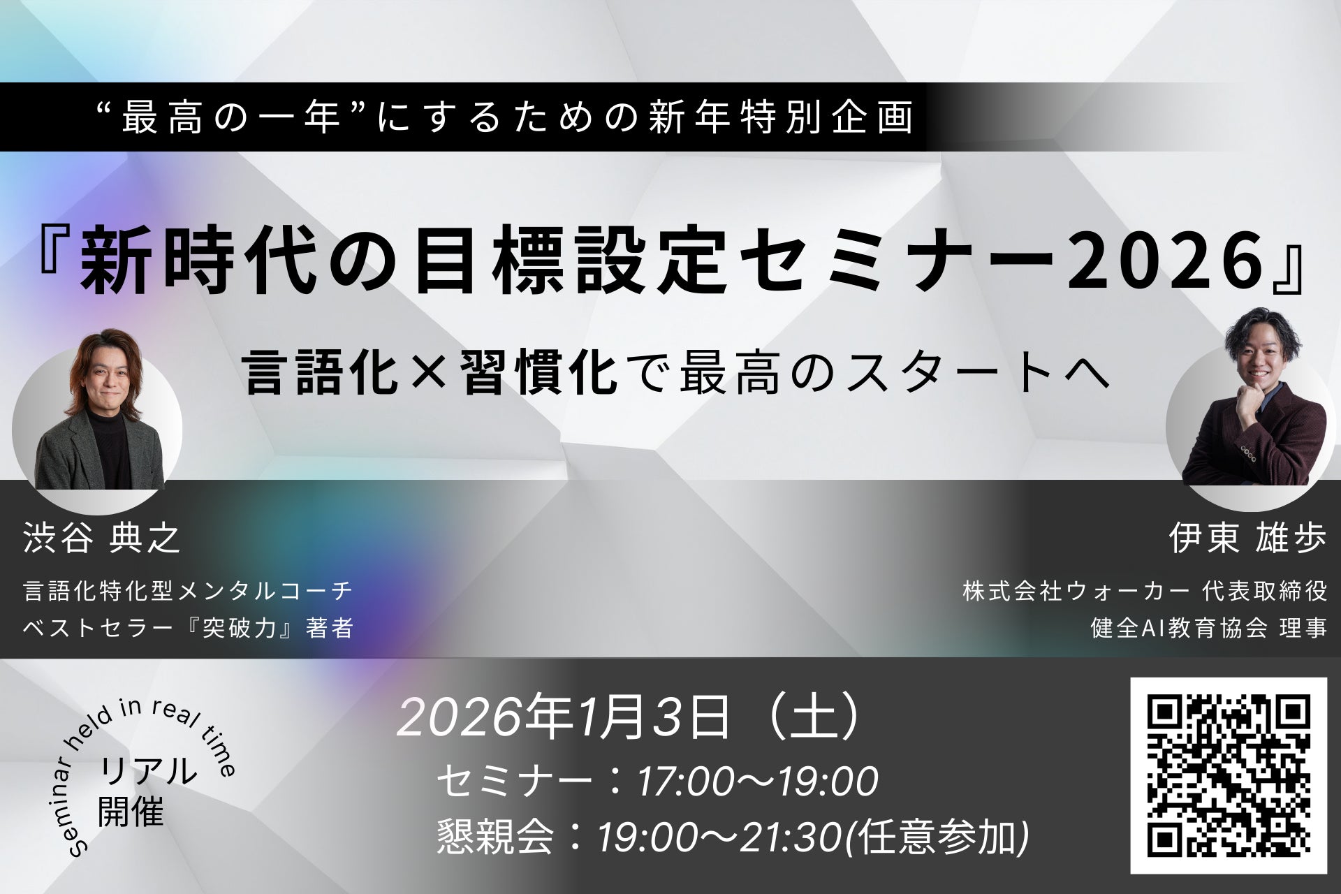 2026年1月3日に、言語化のプロフェッショナルである伊東雄歩(新人類育成計画 主催)と、習慣化のプロフェッショナルである渋谷典之(言語化特化型メンタルコーチ)が共催する特別イベント『新時代の目標設定セミナー2026』を開催します。