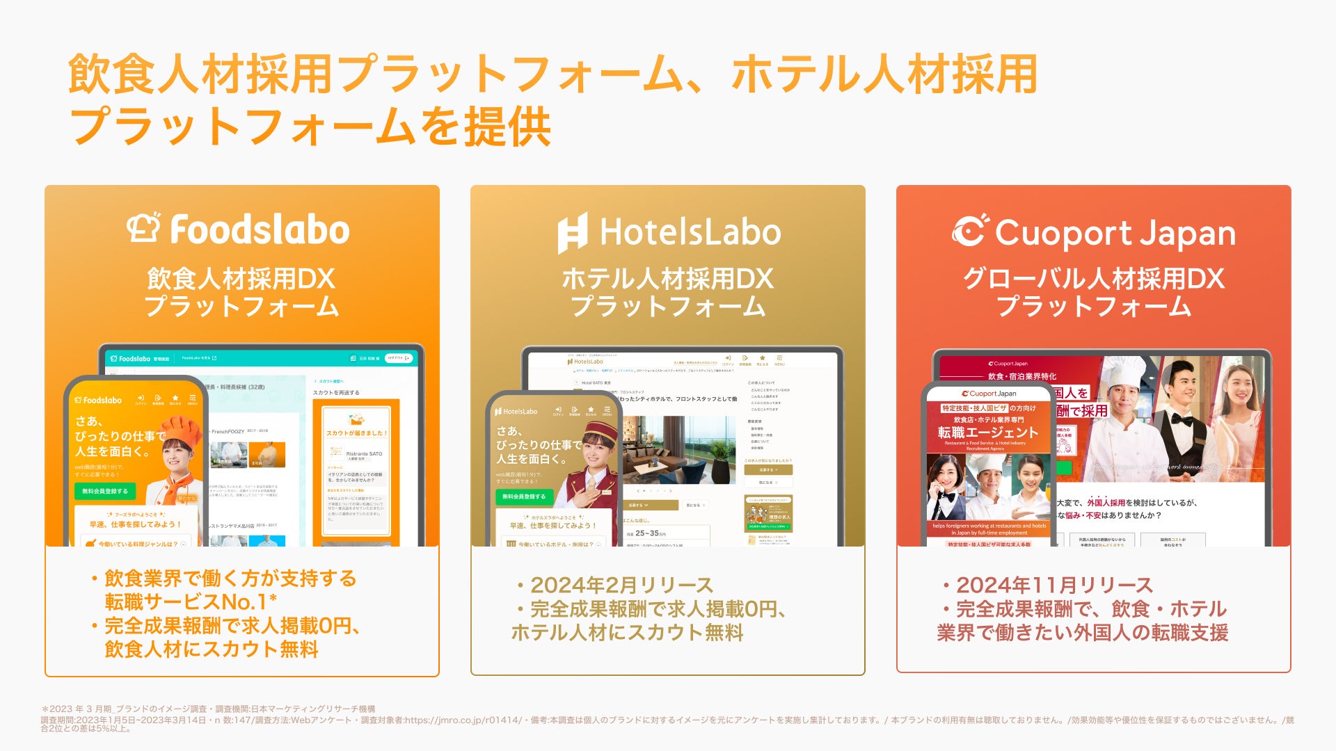 インバウンドが過去最高を更新し続ける中、日本の「おもてなし」を支える飲食・ホテル業界では、慢性的な人材不足という大きな社会課題に直面しています。当社は、飲食人材採用プラットフォーム「FoodsLabo」、ホテル人材採用プラットフォーム「HotelsLabo」という2つの業界特化型プラットフォームを通じて、この課題に正面から向き合っています。