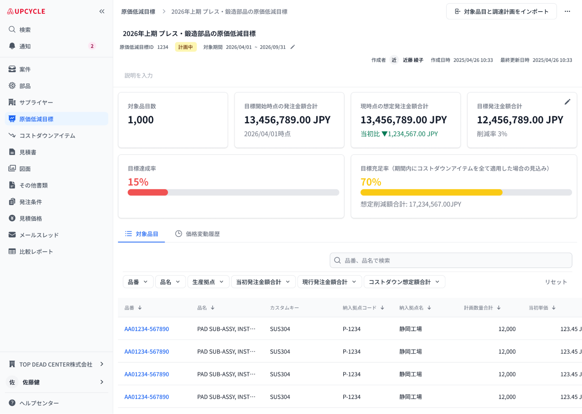 サプライヤー軸、特定のグループ軸で部品をまとめ、目標原価を設定したうえで価格変動を集計・把握できます。