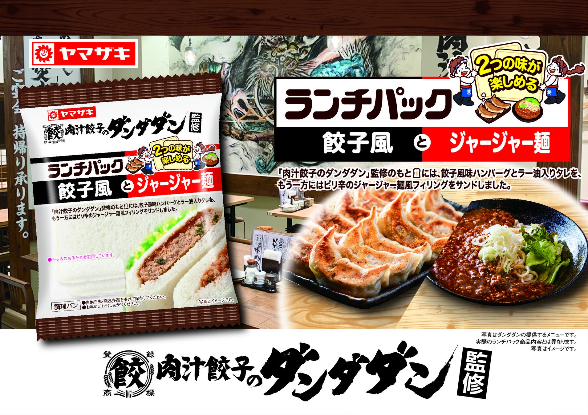 「ランチパック(餃子風とジャージャー麵)」は、肉汁餃子のダンダダンの「肉汁餃子とジャージャー麵」をイメージしたランチパックで、餃子風味ハンバーグとラー油入りタレを、もう1つには、ピリ辛のジャージャー麺風フィリングをサンドし、1袋で2種類の味をお楽しみいただけます。