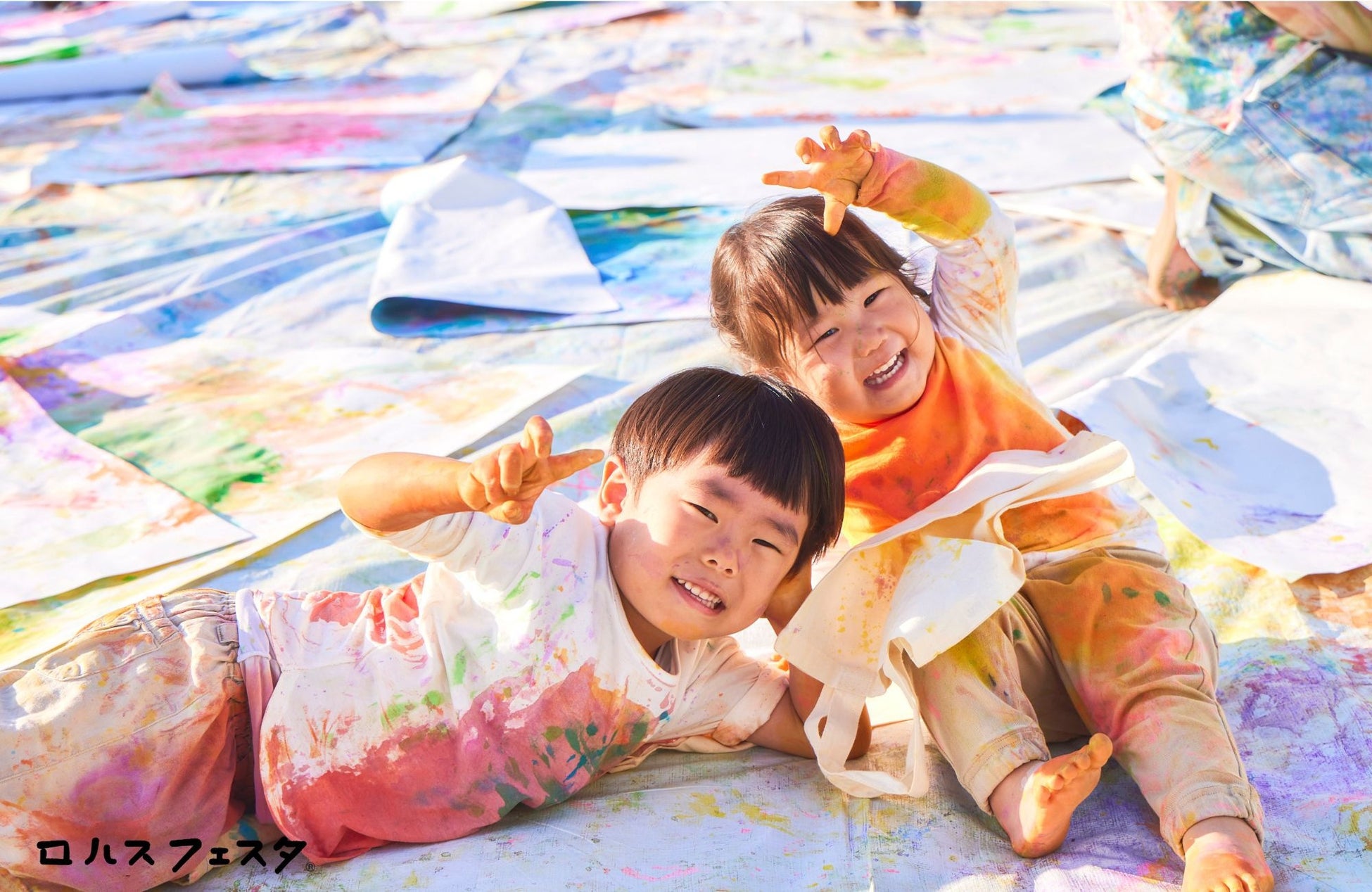 水遊びや泥遊びと同じように、手足や全身を使い、絵の具の感触を楽しみながら自由に絵を描いて遊ぶ「絵の具であそぼう!」を11/8に開催。床に敷いた紙の上でダイナミックに絵を描き、みんなで絵の中、虹の中を泳いでいるような時間を過ごします。最後にお絵描きしたエコバッグのお土産も。