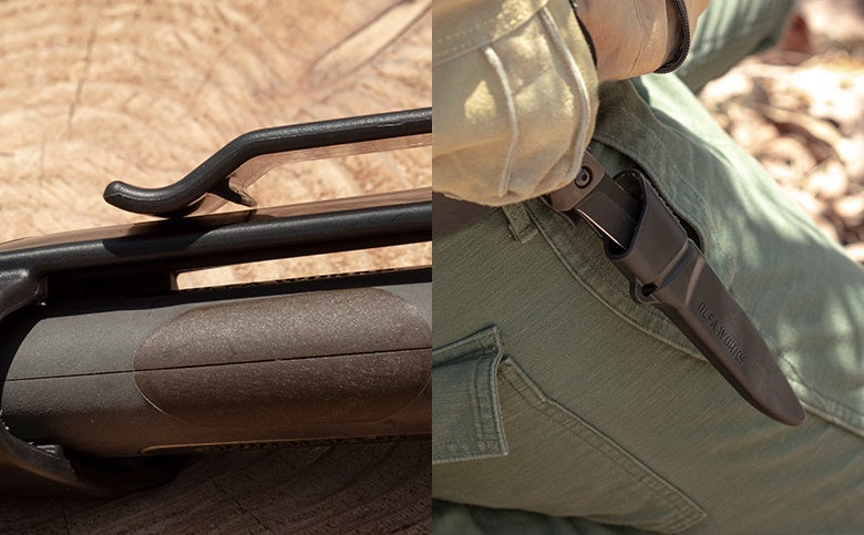 シースはベルトなどに取り付け可能なクリップを一体化。不意に外れることがないよう、クリップの内側には返しが付いています。