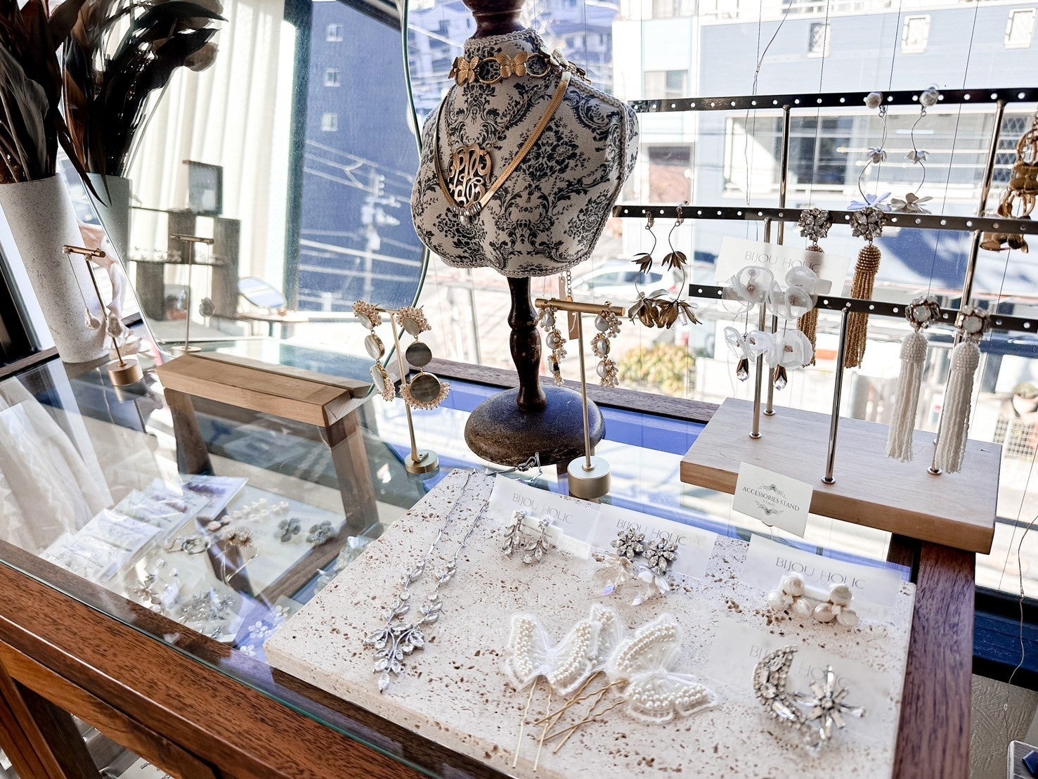 おしゃれ花嫁様が自分らしくお気に入りのアクセサリーを見つけられるよう種類豊富に。金属アレルギー対応ブライダルピアス、イヤリングからヘッド、和装髪飾り、ベールやグローブまで一式揃えられるブライダルアクセサリーショップです。ウェブショップからスタートし、2022年に千葉にアトリエ店舗をオープン。千葉だけでなく東京都内や埼玉、神奈川からも花嫁様に来店頂いてます。