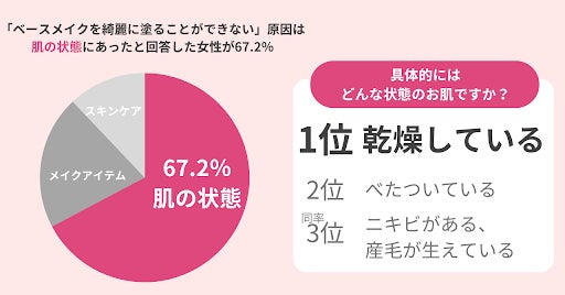 調査の結果、67.2%の女性が「肌の状態」がベースメイクをきれいに塗れない原因だったと考えていることがわかりました。また、ベースメイクをきれいに塗ることができなかった肌の状態は、「乾燥している肌」だという回答が最も多く集まりました。