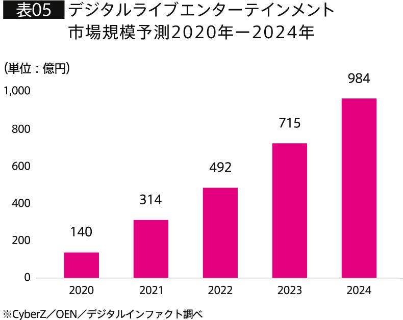 ※表05:デジタルライブエンターテインメント市場規模予測2020年ー2024年、株式会社CyberZ、株式会社OEN、株式会社デジタルインファクト