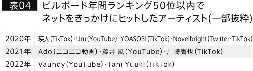※表04:ビルボード年間ランキング50位以内でネットをきっかけにヒットしたアーティスト(一部抜粋)、Billboard JAPAN Year End2020~2022/Hot100
