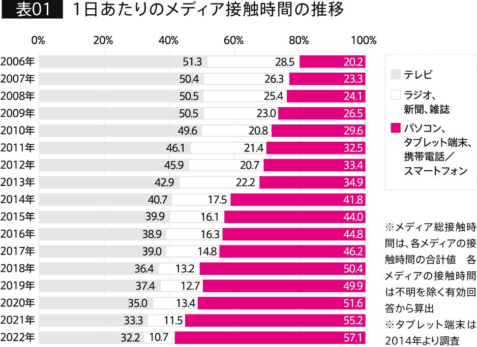 ※表01:1日あたりのメディア接触時間の推移、株式会社ビデオリサーチ、2021年実施