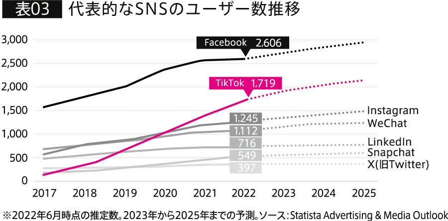 ※表03:代表的なSNSのユーザー数推移、スタティスタ・ジャパン株式会社