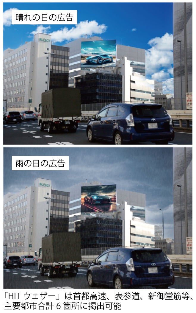 多くの企業は、これまでは広告掲載期間中に1種類の広告だけを掲出してきましたが、「HITウェザー」を利用することで、天気に合わせて複数の広告を出し分けることが可能になります。例えば、自動車メーカーの場合、屋外広告デジタルボートが設置されている場所の天気が晴れならば、快適なドライビング体験を提案する広告を、雨の予報が出たら、近くのショールームに誘導する広告を掲出するといった形で、広告を見ている人がいる場所の天気に合わせて、広告の出し分けができるようになります。