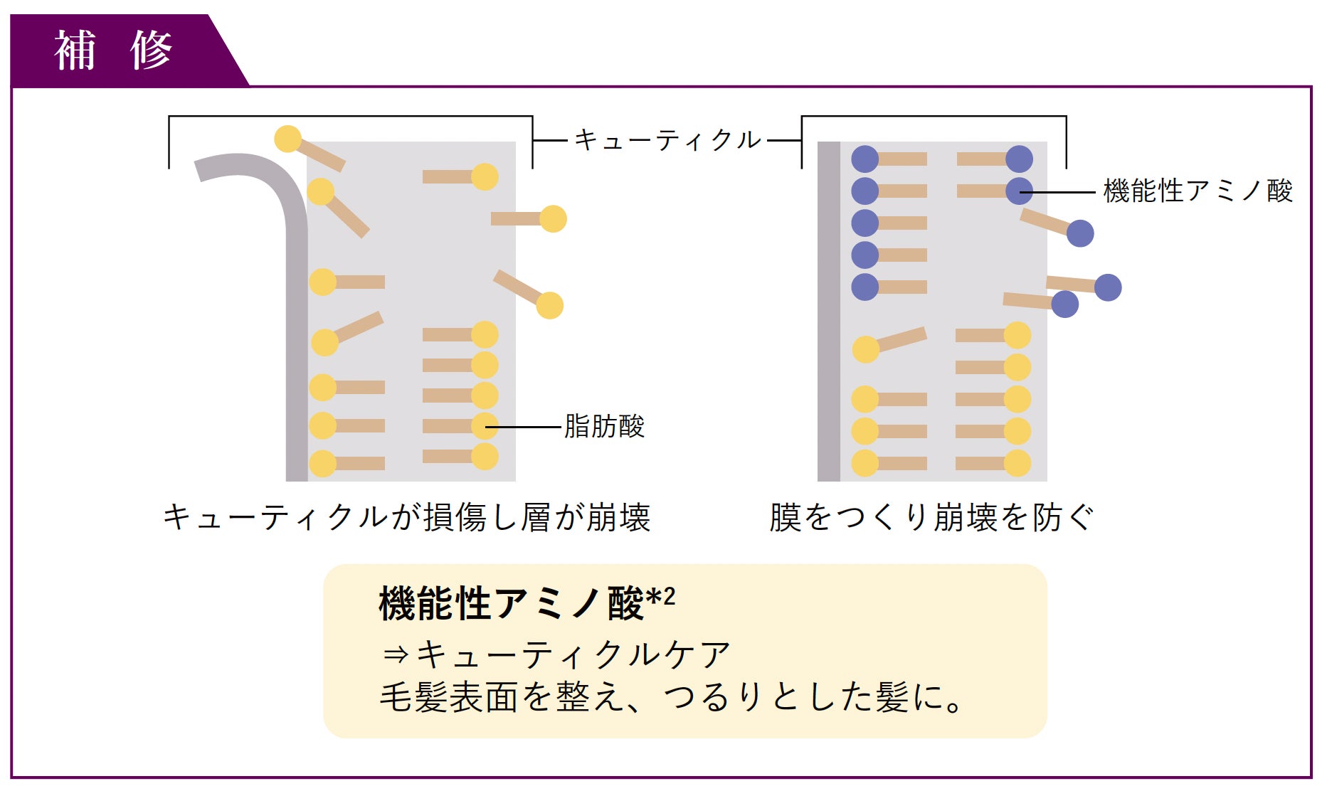 →機能性アミノ酸**が髪に必要なケア成分***を導入、キューティクルを補修し、つるんと指通りのよい髪へ。