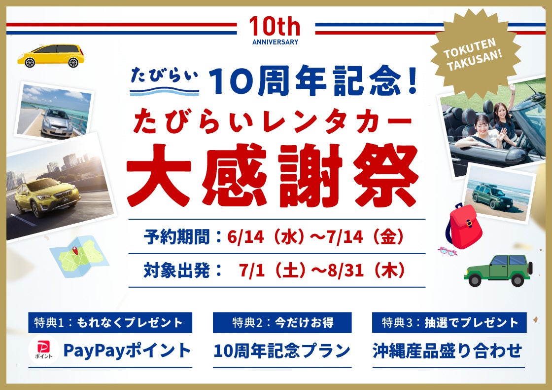 株式会社パム(本社:沖縄県那覇市、社長:長嶺 由成)は、旅行情報サイト「たびらい」のたびらいレンタカー(https://www.tabirai.net/car/)にて、「たびらい10周年記念!たびらいレンタカー大感謝祭」を開催します。「たびらいレンタカー大感謝祭」ではユーザーに感謝を込めて嬉しい特典を3つご用意しました。