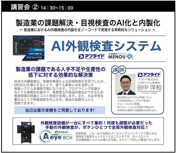 AI外観検査オールインワンシステム展示: AI外観検査導入に必要な機材全てを備えたオールインワンシステム「A eye BOX」や、プログラミング不要のAI開発プラットフォーム「MENOU」を展示。導入プロセスをご体験いただけます。当日、検証用サンプルをお持ち込みいただければ、無料PoC(概念実証)も実施可能です。