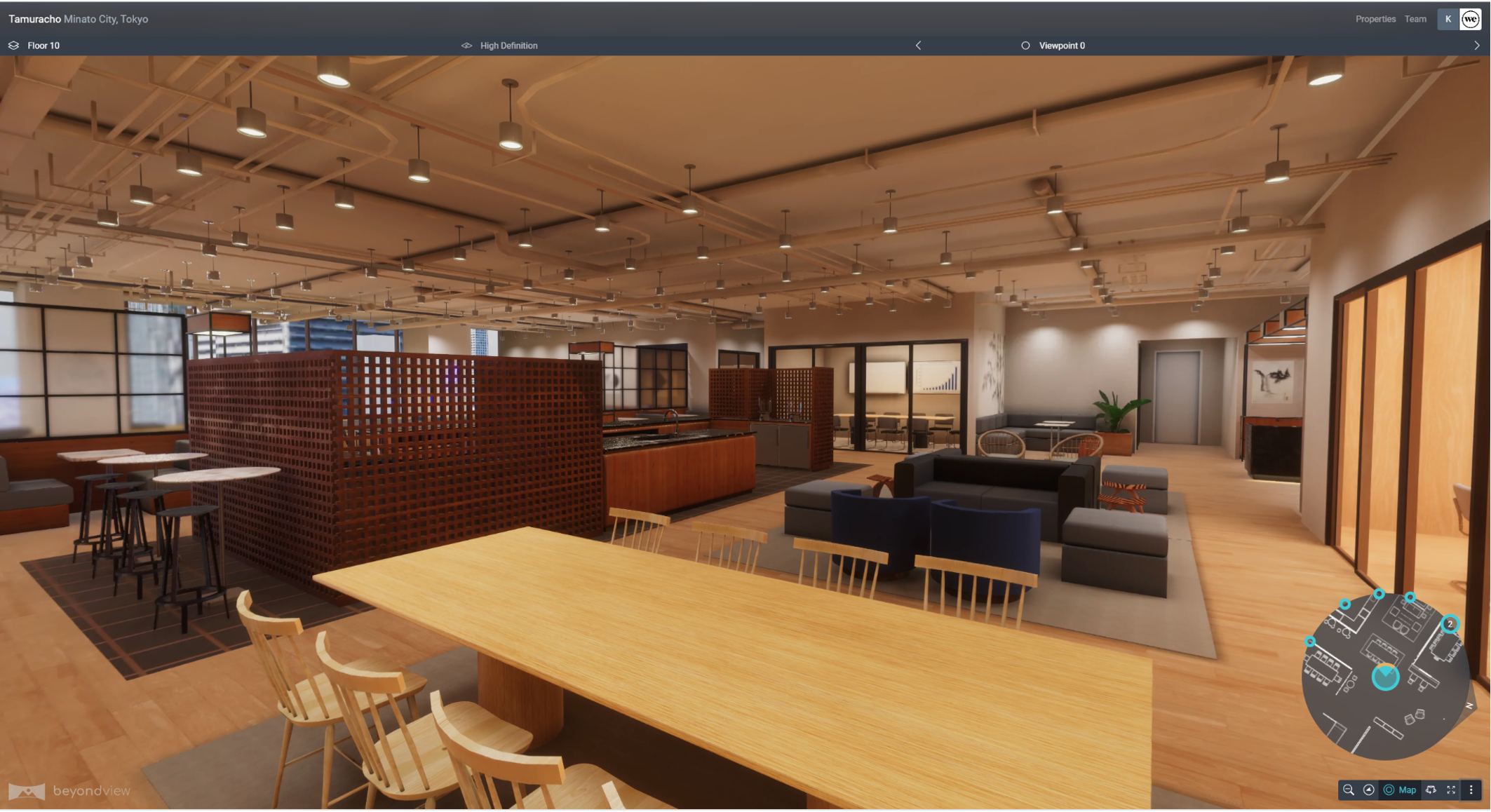 デジタルツインとは、物理的な物体、プロセス、サービスをデジタルで表現したものです。BeyondViewは、不動産の高精細デジタル版を作成します。この技術により、WeWork Japanは、お客様が未来のワークスペースを選択し、決定し、移転に向けた準備を行う全てのプロセスにおける利便性を向上し、コラボレーションとインタラクションを効率化することが可能になります。