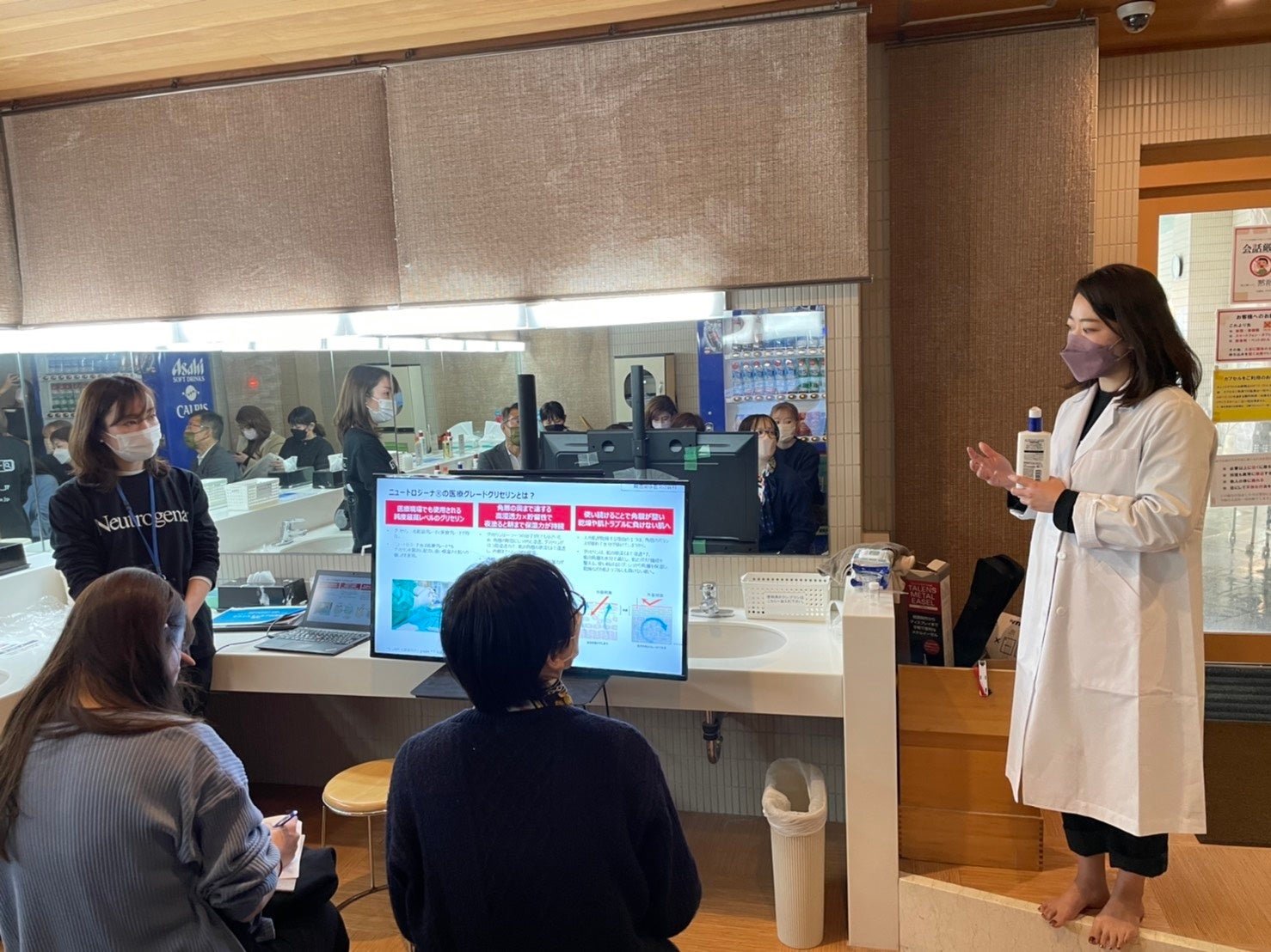 イベントでは、ジョンソン・エンド・ジョンソンの研究開発担当の水野紗耶香が登壇し、医療グレードのグリセリン(※1)をふんだんに配合した「ニュートロジーナ®」だからこそ、サウナ後の乾燥に効果的な保湿ケアをご紹介しました。