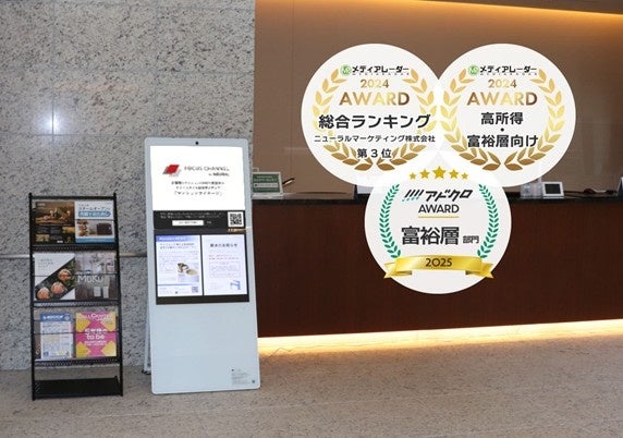 ニューラルマーケティング株式会社(以下、「当社」)が運営するマンションサイネージメディア「FOCUS CHANNEL」は、株式会社アイズが開催した「メディアレーダー2024AWARD」及び株式会社ビズパが開催した「アドクロAward2025」にて、特に人気を集めた広告媒体として2023年に引き続き2年連続で3つの賞を獲得いたしました。