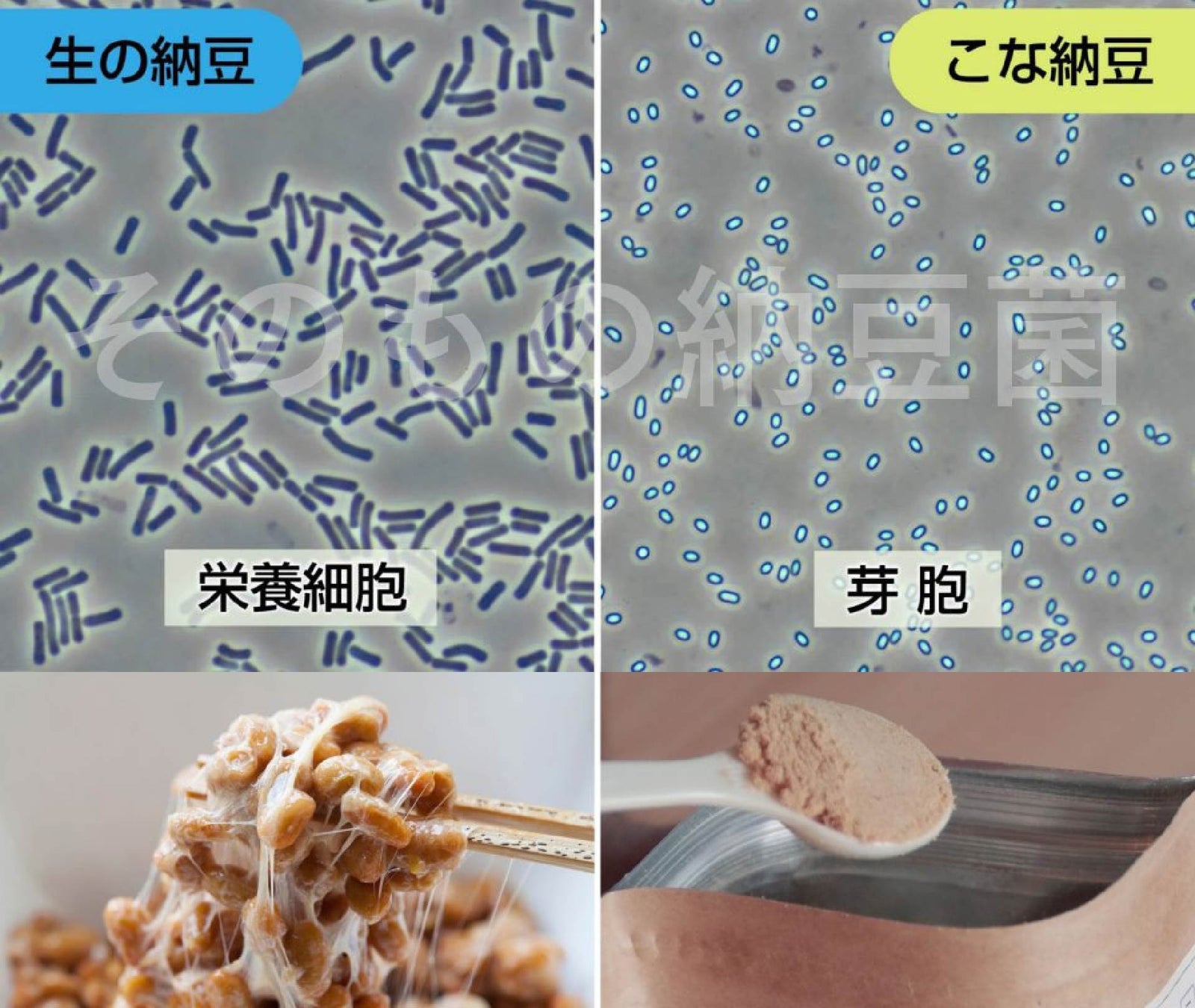 一方、生の納豆をフリーズドライにより粉末化した「こな納豆」の場合、製造の過程で生育に適さない独自の環境下に置くことで、芽胞化させています。芽胞状の納豆菌は胃酸にも耐え、生きて腸まで届くと考えられます。