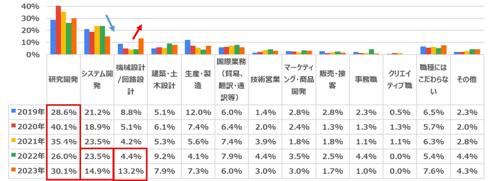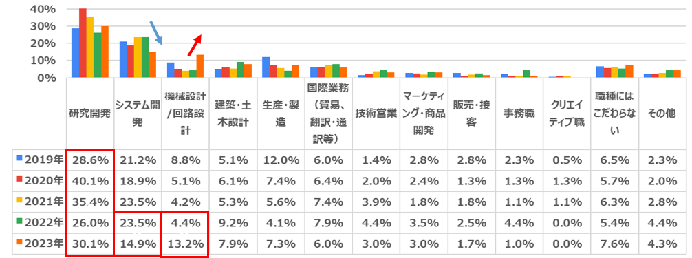 「研究開発」が5年連続1位に。これは、回答者の6割近く(56.3%)が大学院生であることも理由の1つと考えられます。2位「システム開発」(14.9%)は昨年比8.6pt減でしたが、3位「機械設計/回路設計」(13.2%)は昨年比8.8pt増となりました。
