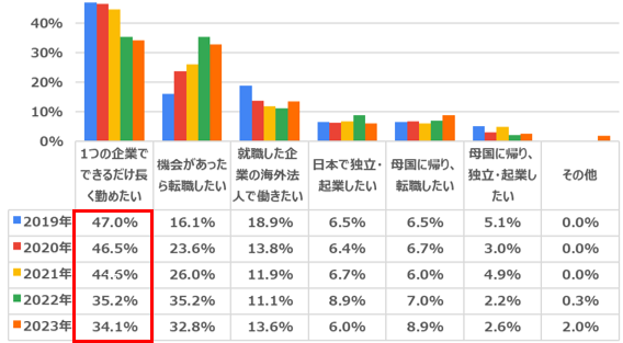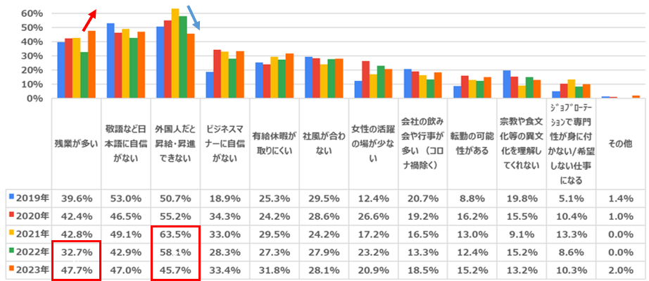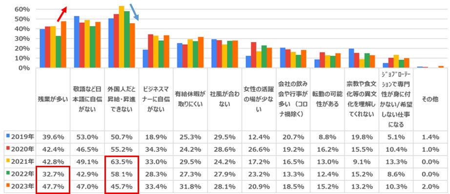 「残業が多い」(47.7%)が昨年比15.0pt増と大幅にアップし、初めて1位に。働き方改革などにより、少しずつ労働環境が改善されていますが、残業や長時間労働などはいまだに多くの日本企業の慣習としてあり、ニュースでも取り上げられています。一方、「外国人だと昇給・昇進できない」は、2021年と2022年は6割前後で1位でしたが、今年は昨年比12.4pt減の45.7%で3位に下がりました。