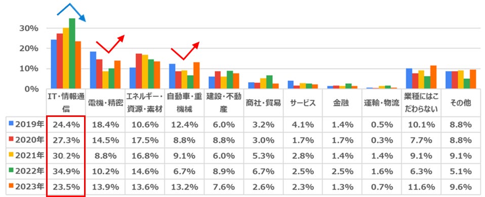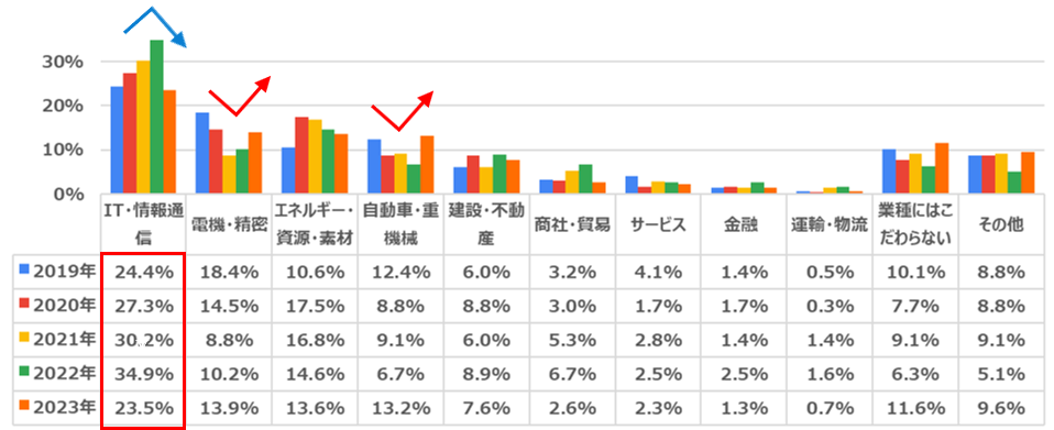 「IT・情報通信」(23.5%)は5年連続1位となり人気の高い業種ですが、昨年と比べて11.4ptも大幅に減りました。2位以下は「電機・精密」(13.9%)、「エネルギー・資源・素材」(13.6%)、「自動車・重機械」(13.2%)が拮抗。「電機・精密」と「自動車・重機械」はコロナ禍で減少しましたが再び増加し、特に「自動車・重機械」は昨年比6.5pt増となりました。