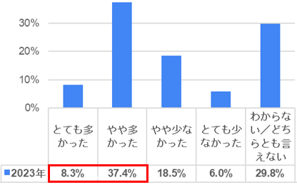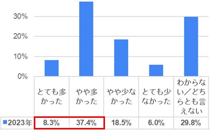 「多かった」(とても多かった+やや多かった)が45.7%に対し、「少なかった」(とても少なかった+やや少なかった)が24.5%となり、2023年の求人が多かったと感じる人の方が多いことがわかりました。