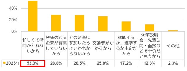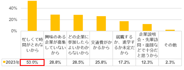 半数以上(53.0%)が「忙しくて時間がとれないから」と回答。学業とインターンシップの同時進行は忙しく、両立は難しいと考える留学生が多いようです。次いで「興味のある企業が募集していないから」(28.8%)と「どの企業に参加したらよいかわからないから」(28.5%)が約3割となり、ほぼ同数になりました。