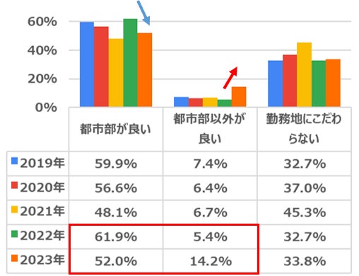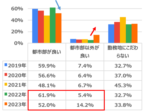 「都市部が良い」(52.0%)は昨年比9.9pt減だった一方で、「都市部以外が良い」(14.2%)は昨年比8.8pt増となり初めて1割を超え、差が縮まりました。また、「勤務地にこだわらない」は昨年とほぼ同数で3割超(33.8%)という結果になりました。
