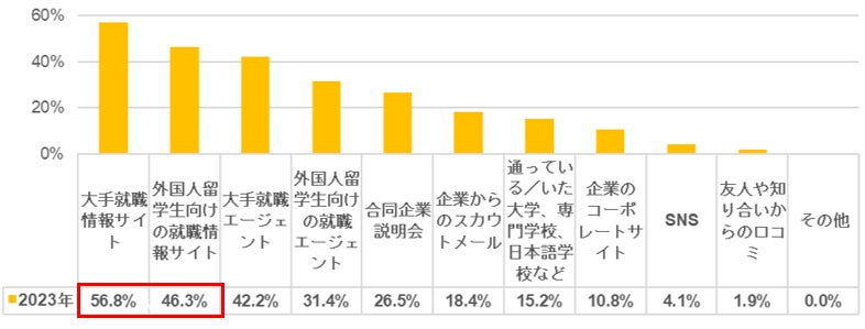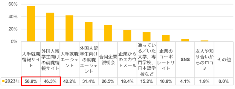 最も多かったのが「大手就職情報サイト」(56.8%)で、次いで『リュウカツ』などの「外国人留学生向けの就職情報サイト」(46.3%)という結果になりました。日本人学生と同様に、外国人留学生も求人情報やインターンシップ、説明会、合同就活イベントなど効率よく情報収集できる就職情報サイトを活用していることがわかりました。