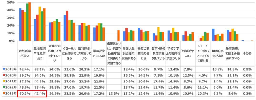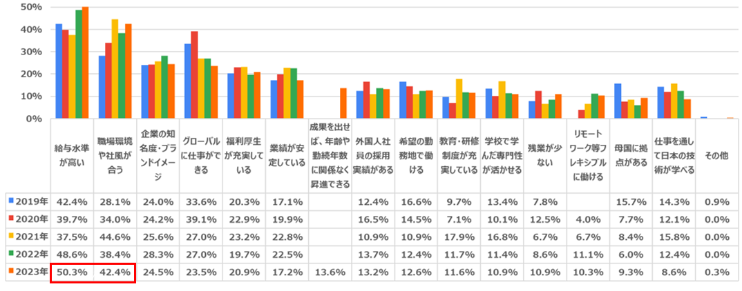 1位「給与水準が高い」は2021年から2022年で11.1ptも大幅に増えましたが、今年はさらに増え、初めて5割を超えました(50.3%)。2位「職場環境や社風が合う」も4割を超え(42.4%)、この2つを重視していることがわかりました。