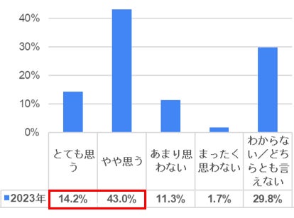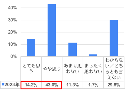 「思う」(とても思う+やや思う)が57.2%に対し、「思わない」(まったく思わない+あまり思わない)が13.0%となりました。